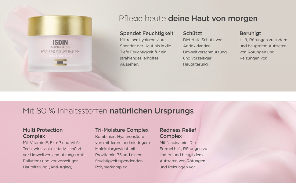 Hyaluronic Moisture Sensitive Feuchtigkeitspflege für empfindliche und zu Rötungen neigende Haut, sorgt für ein angenehmes Hautgefühl und ein gesundes Aussehen der Haut.