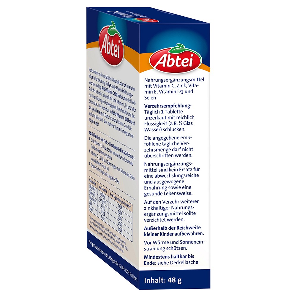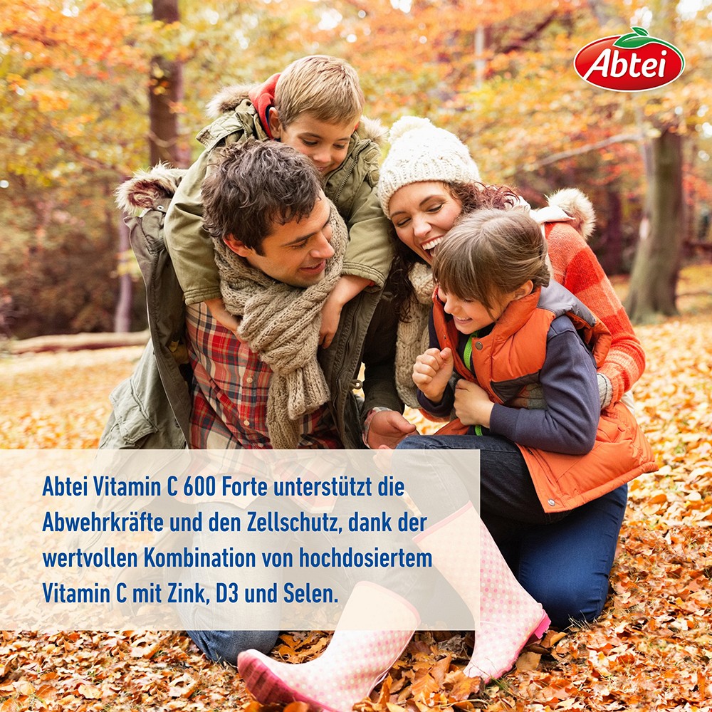 In der kalten Jahreszeit, bei Stress oder intensiver körperlicher Belastung ist das Immunsystem besonders gefordert. Abtei Vitamin C 600 Forte mit hochdosiertem Vitamin C sowie Zink, Vitamin D3, E und Selen unterstützt ein gesundes Immunsystem und trägt zum Schutz der Zellen vor oxidativem Stress bei.