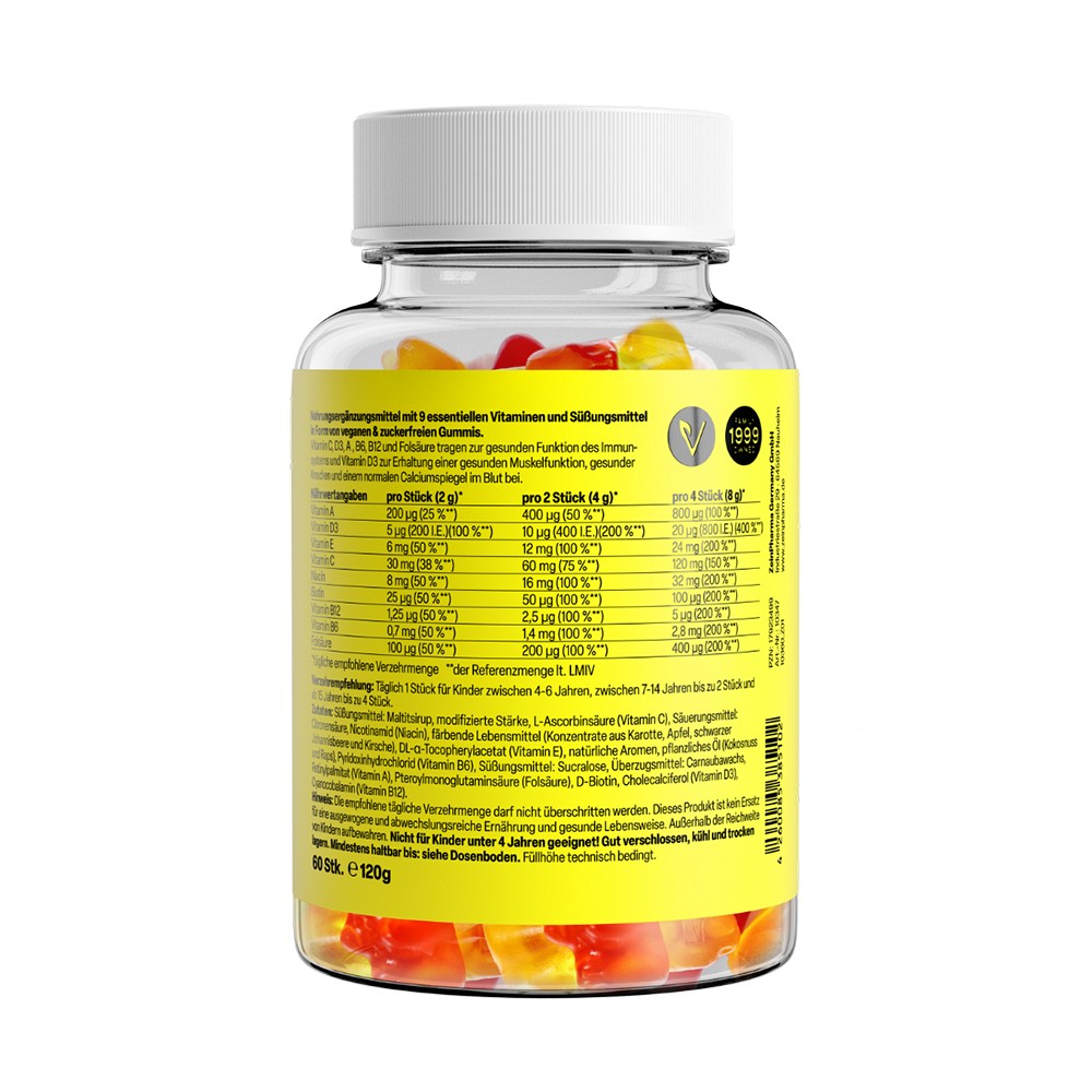 Pro Gummi sind die folgenden Vitamine enthalten: 200 µg Vitamin A, 5 µg Vitamin D3, 6 mg Vitamin E, 30 mg Vitamin C, 8 mg Niacin, 25 µg Biotin, 1,25 µg Vitamin B12, 0,7 mg Vitamin B6, 100 µg Folsäure.