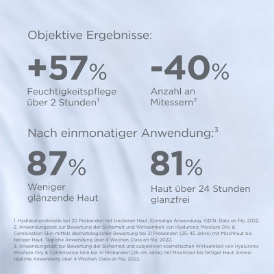 ³ Subjektive Bewertung des Anwendungstests von Hyaluronic Moisture Oily & Combination Skin bei 31 Probanden (25-45 Jahre) mit Mischhaut bis fettiger Haut. Tägliche Anwendung über 4 Wochen. Data on file, 2022.