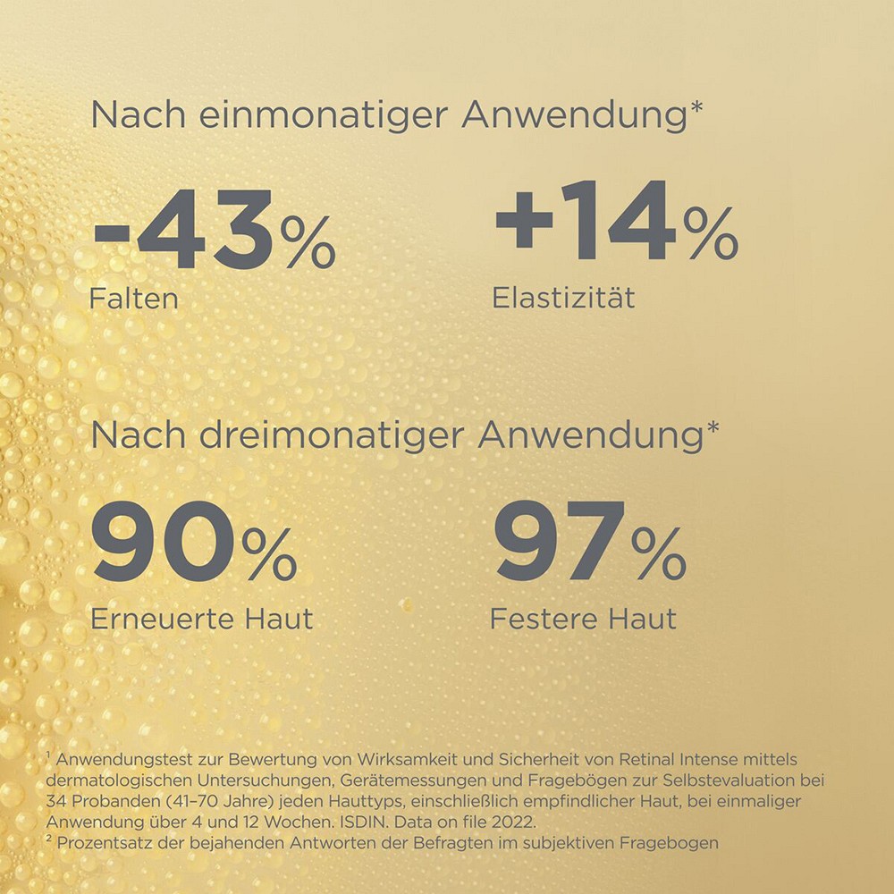 ¹ Anwendungstest zur Bewertung von Wirksamkeit und Sicherheit von Retinal Intense mittels dermatologischen Untersuchungen, Gerätemessungen und Fragebögen zur Selbstevaluation bei 34 Probanden (41–70 Jahre) jeden Hauttyps, einschließlich empfindlicher Haut, bei einmaliger Anwendung über 4 und 12 Wochen. ISDIN. Data on file 2022.