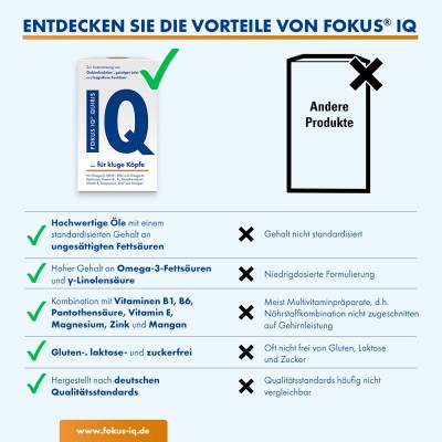 FOKUS IQ® unterstützt Ihre mentale Gesundheit dank sinnvoll kombinierter Mikronährstoffe.- FÖRDERT DIE KONZENTRATION: Der in FOKUS IQ® enthaltene Nährstoffkomplex versorgt das Gehirn gezielt mit konzentrationsfördernden Inhaltsstoffen und kann Ermüdungserscheinungen verringern.