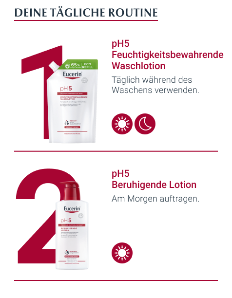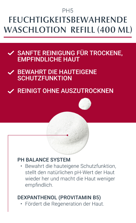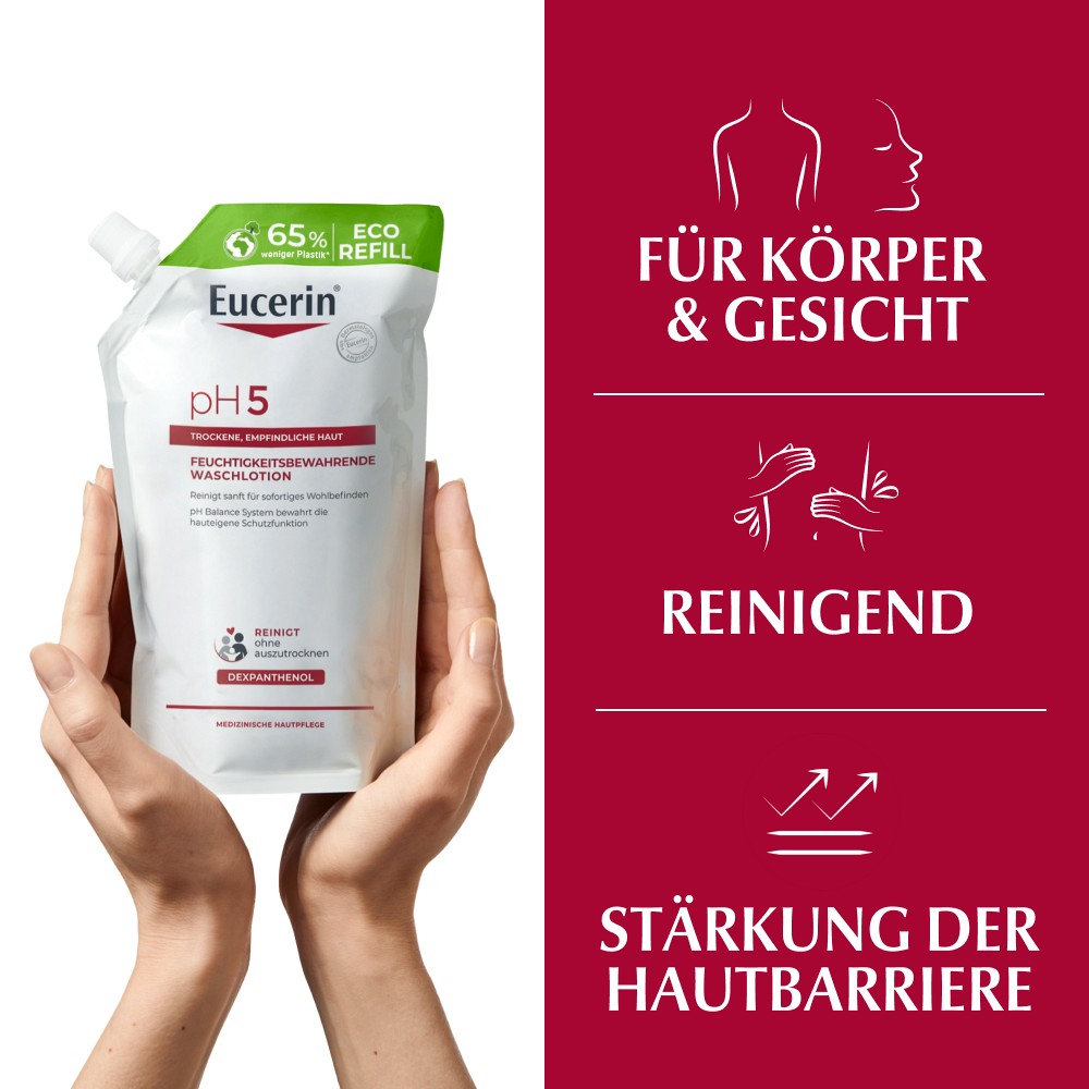 Eucerin pH5 Waschlotion eignet sich speziell für die milde Reinigung von empfindlicher, trockener Haut. Denn diese neigt dazu, besonders auf Umweltreize mit Spannungsgefühl, Hautrötungen und Irritationen zu reagieren. Daher braucht strapazierte Haut eine besonders milde Reinigung, die die physiologische Balance der Haut aufrechterhält.Die Waschlotion ist ein seifenfreies Reinigungsprodukt und ist daher besonders für die milde Reinigung von Gesicht und Körper geeignet. Der natürliche pH-Wert und Dexpanthenol bewahrt nachweislich die natürliche Schutzfunktion und Widerstandskraft der Haut. Die Formel sorgt für eine sanfte Reinigung mit extra milden, seifenfreien Tensiden.