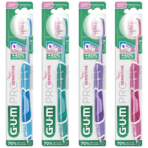 Sie haben schmerzempfindliche Zähne oder gereiztes Zahnfleisch? Die GUM PRO SENSITIVE Zahnbürste unterstützt Sie bei Ihrer täglichen Zahnpflege. Dank der extra weichen Borsten bietet sie Ihnen eine gründliche, ultrasanfte Reinigung und ein angenehmes Putzerlebnis. Mit den mikrofeinen Borstenenden erreichen Sie auch schwer zugängliche Stellen, um Plaque zu entfernen.