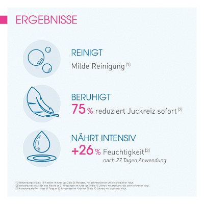 (1) Verwendungstest über eine Woche an 21 Probanden im Alter von 18 bis 70 Jahren, mit trockener bis sehr trockener Haut im Gesicht und am Körper und empfindlicher und/oder reaktiver Haut im Gesicht oder am Körper.