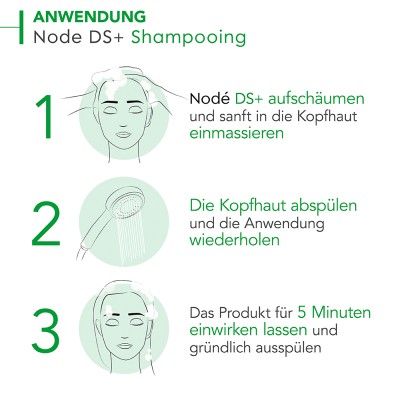 Nodé DS+ aufschäumen und sanft in Ihre Kopfhaut einmassieren. Die Kopfhaut abspülen. Die Anwendung wiederholen. Das Produkt 5 Minuten einwirken lassen. Zum Schluss gründlich ausspülen.
