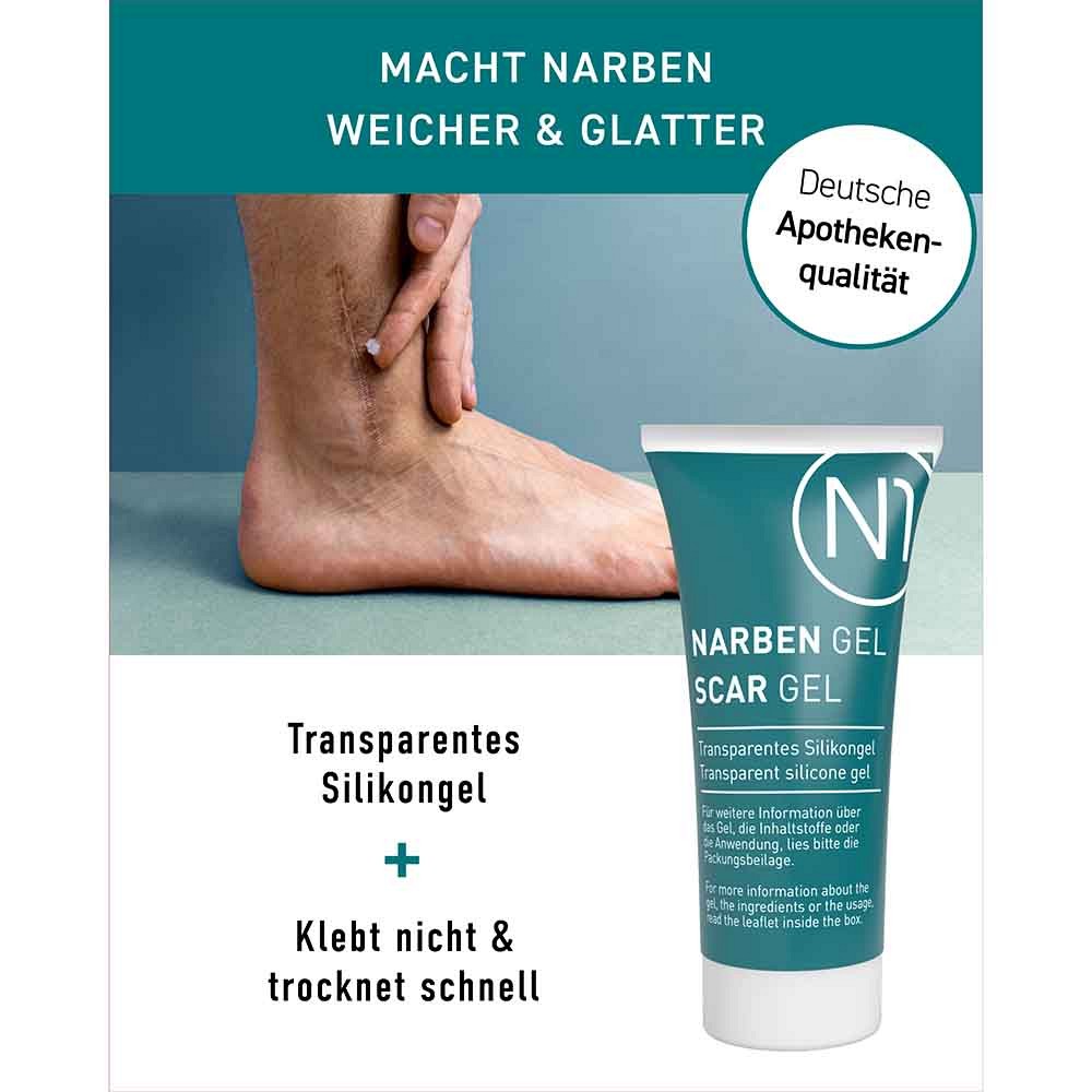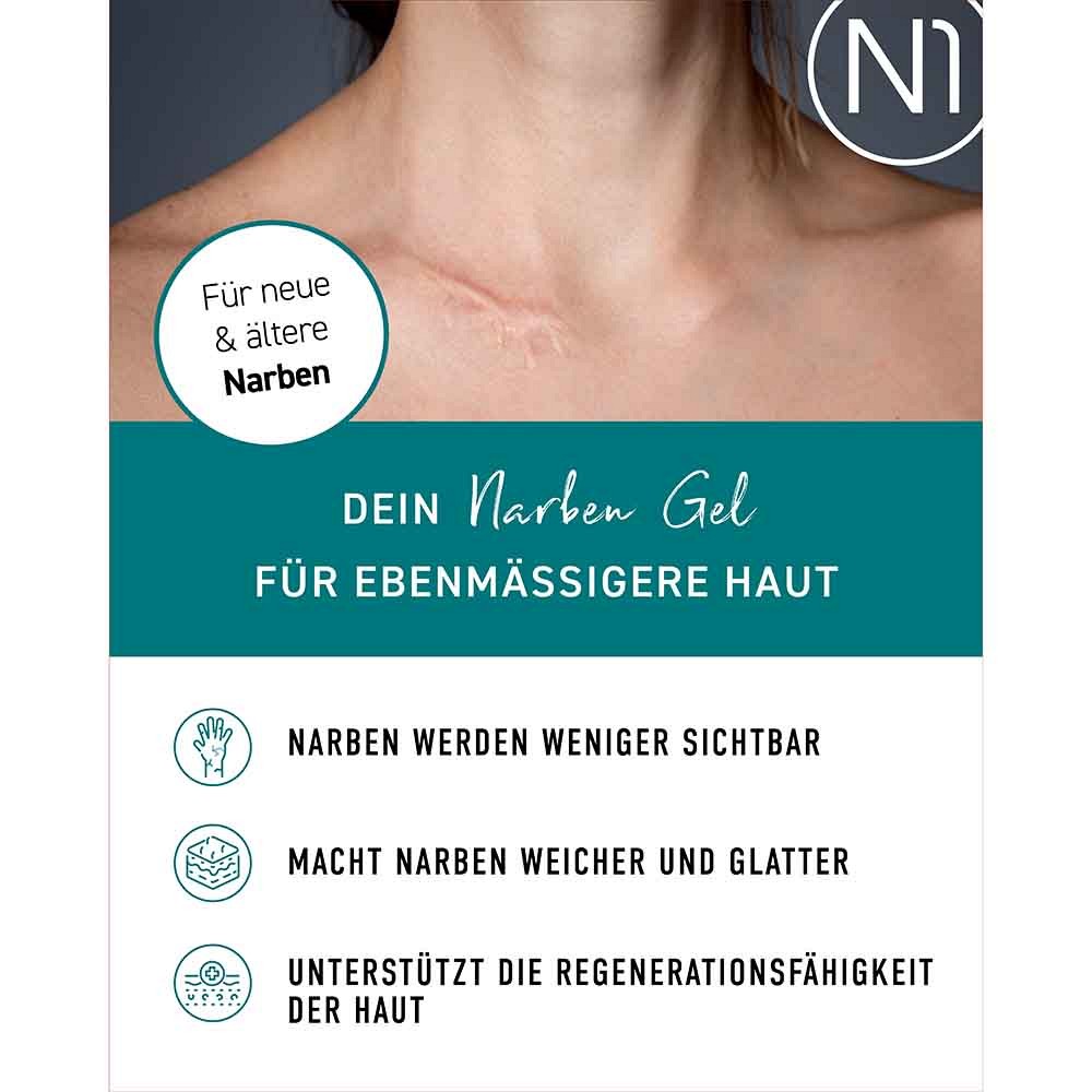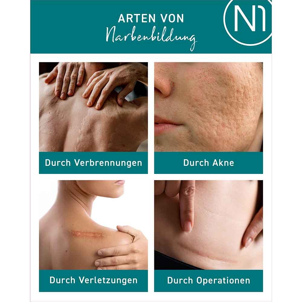 Das N1 Narben Gel ist ein Medizinprodukt in Form eines transparenten Siliziumgels. Das Gel reduziert die Bildung von Narben und vermindert ihre Sichtbarkeit, die durch Verbrennungen, Akne, Operationen, Verletzungen oder Hautinfektionen entstanden sind.Das N1 Narbengel kann sowohl bei neuen als auch bei bestehenden Narben angewendet werden.Bei der Anwendung des N1 Narben Gels werden die Narben flacher, weicher, elastischer und weniger sichtbar. Rötungen, Verfärbungen, Hautverdickungen und Juckreiz werden reduziert, Narben-Schmerzen gelindert.