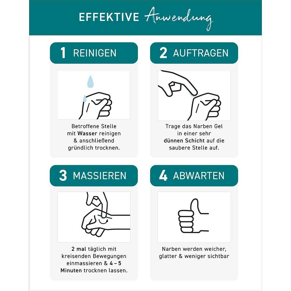 Massiere das Gel 2-mal täglich mit kreisenden Bewegungen in die Narbe und die umliegende Haut ein. Lasse das Gel für ca. 4 bis 5 Minuten trocknen. Überschüssiges Gel kannst du mit einem Tuch oder Taschentuch entfernen. Wenn das Gel getrocknet ist, kannst du nach Belieben Kosmetika auftragen.