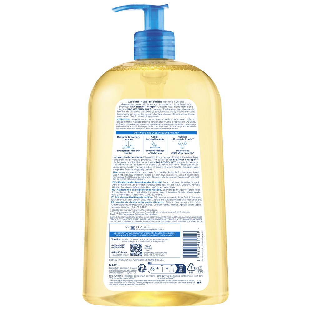 Atoderm Huile de douche enthält, wie alle BIODERMA Produkte, 9-fach gereinigtes Wasser, welches dem Zellwasser in unseren Hautzellen sehr ähnlich und somit höchst verträglich ist.