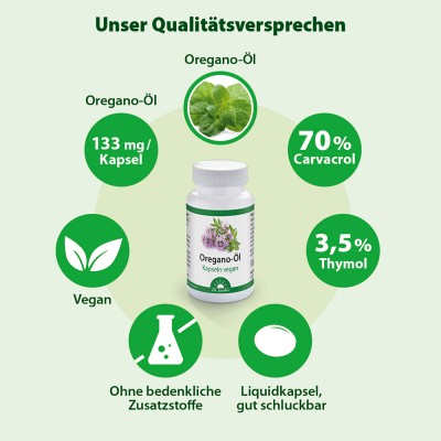 Oregano-Pflanzen bestehen zu ca. 0,1 bis 1 % aus ätherischem Öl. Für die Oregano-Öl Kapseln von Dr. Jacob’s wird dieses schonend mittels Wasserdampfdestillation aus der Pflanze gewonnen. Das ätherische Oreganoöl enthält die besonders wertgebenden Komponenten Carvacrol und Thymol (phenolischen Monoterpene).In jeder Kapsel sind 133 mg Oreganoöl enthalten, das zu 3,5 % aus Thymol und zu 70 % aus Carvacrol besteht. Eingebettet ist das Oreganoöl in naturreines Olivenöl erster Güteklasse.