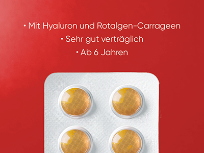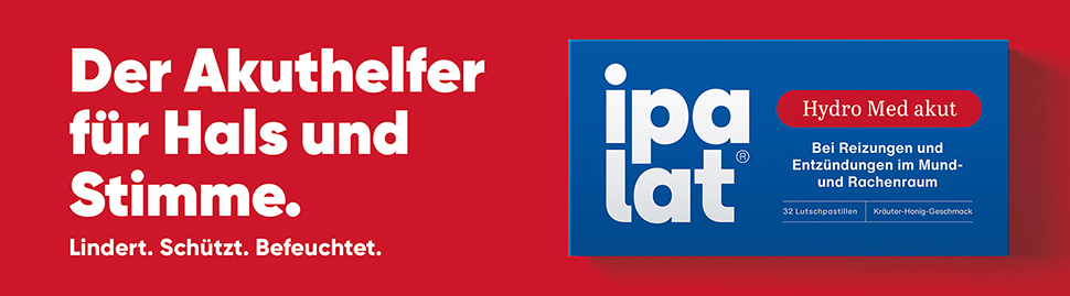 Die ipalat Hydro Med akut Lutschpastillen lindern durch ihren einzigartigen Wirkstoffkomplex mit Hyaluron und Rotalgen-Carrageen* schnell und langanhaltend Hals- und Stimmbeschwerden.