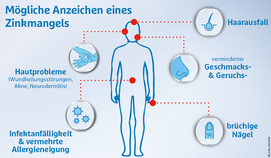 Ein Zinkmangel kann sich durch eine Vielzahl von Symptomen äußern, die oft schwer zuzuordnen sind. Häufige Anzeichen können eine erhöhte Anfälligkeit für Infektionen durch ein geschwächtes Immunsystem sein, was sich beispielsweise durch häufige Erkältungen bemerkbar macht.Auch eine verzögerte Wundheilung, verstärkte Hautprobleme wie Akne, Neurodermitis oder trockene Haut sowie Haarausfall und brüchige Nägel können auf einen Zinkmangel hinweisen. Weitere Symptome können Appetitverlust, Geschmacksstörungen oder eine verstärkte Neigung zu Allergien sein.