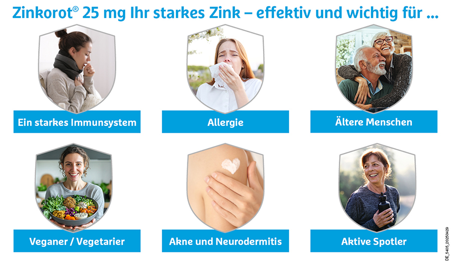 * Zinkorot 25 mg ist das am häufigsten in der Apotheke abgegebene Zink-Mono-Arzneimittel in Deutschland gemäß IQVIA, PharmaTrend, Zinkpräparate 04F4, Abverkauf Offizin, MAT 01/2025.1 Classen et al. MMP 2020;43(4):149–157