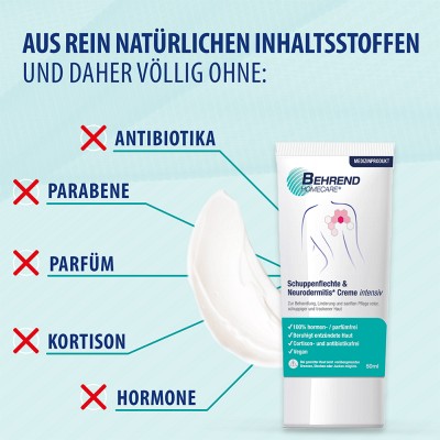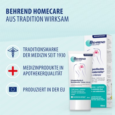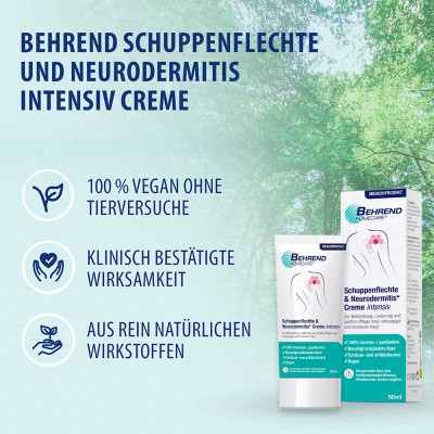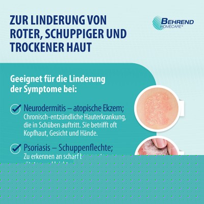 Behrend® Schuppenflechte &. Neurodermitis Intensiv Creme ist ein topisches Medizinprodukt zur Linderung der Symptome von Ekzem, Neurodermitis und Schuppenflechte (Psoriasis), wie Jucken, Rötung, Schuppen und trockene Haut. Neurodermitis und Psoriasis sind chronische, schubförmig wiederkehrende entzündliche Hautveränderungen, die mitdiverse Immunbeeinträchtigungen einhergehen.