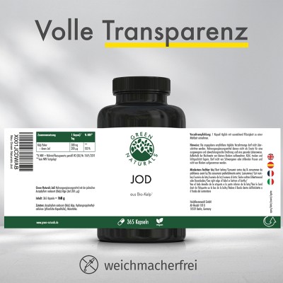 Uns bei Green Naturals liegt die Qualität unserer Produkte sehr am Herzen und dies möchten wir auch unseren Kunden vermitteln. Aus diesem Grund sind wir transparent was die Herkunft unserer Produkte betrifft. All unsere Produkte werden in sorgfältig und streng geprüften Anlagen in Deutschland hergestellt und unterliegen den höchsten Qualitätsstandards. Bei der Entwicklung unserer Produkte achten wir vor allem auf deren Verträglichkeit und Bioverfügbarkeit.Für unsere Green Naturals Jod aus Bio-Kelp Kapseln beziehen wir Kelp-Algen aus biologischem Anbau aus Kanada. So stellen wir die Qualität des Rohstoffes sicher. Dort wird der Rohstoff sonnen- und end-getrocknet. Nach der Reinigung und dem Zermahlen, erfolgt die Prüfung der Bio-Algen in Deutschland. Hier geschieht auch die Abfüllung. Das Resultat ist ein hochwertiges Jod-Produkt mit Bio-Kelp in praktischer Kapselform. Unsere Jod-Kapseln sind zu 100% vegan und frei von Allergenen.