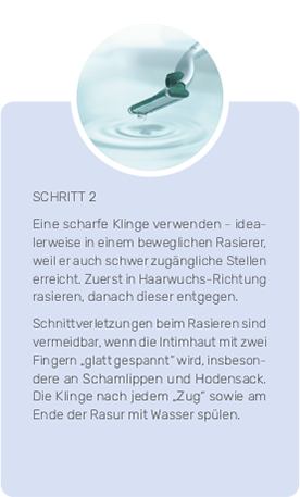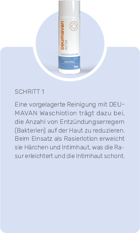 Für die Intimrasur ist die DEUMAVAN Waschlotion auch als Rasierlotion verwendbar, anstelle eines Rasierschaums. Hierfür wird sie nach dem Reinigen etwas aufgeschäumt und erneut auf den zu rasierenden Bereich aufgetragen. Sie erweicht Härchen und Intimhaut, was die Rasur erleichtert und die Intimhaut schont.Sie hilft Verletzungen, und damit „Rasurbrand“ und Rasurpickel, zu vermeiden. So neigen auch nachwachsende Härchen weniger zum Einwachsen in die Haut.