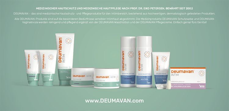 Ist die Intimwaschlotion auch für Männer geeignet?Alle DEUMAVAN Produkte sind gleichermaßen für Frauen und Männer geeignet. DEUMAVAN Waschlotion und Schutzsalbe gibt es als neutrale Variante (ohne Duftstoffe) und mit Lavendel.