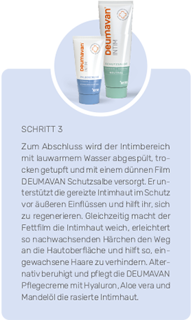 Insbesondere bei strapazierter, trockener oder wunder Haut im Intim- und Analbereich, sowie nach dem Rasieren, Epilieren oder Waxing empfiehlt sich das anschließende Auftragen der DEUMAVAN Schutzsalbe oder der DEUMAVAN Pflegecreme.