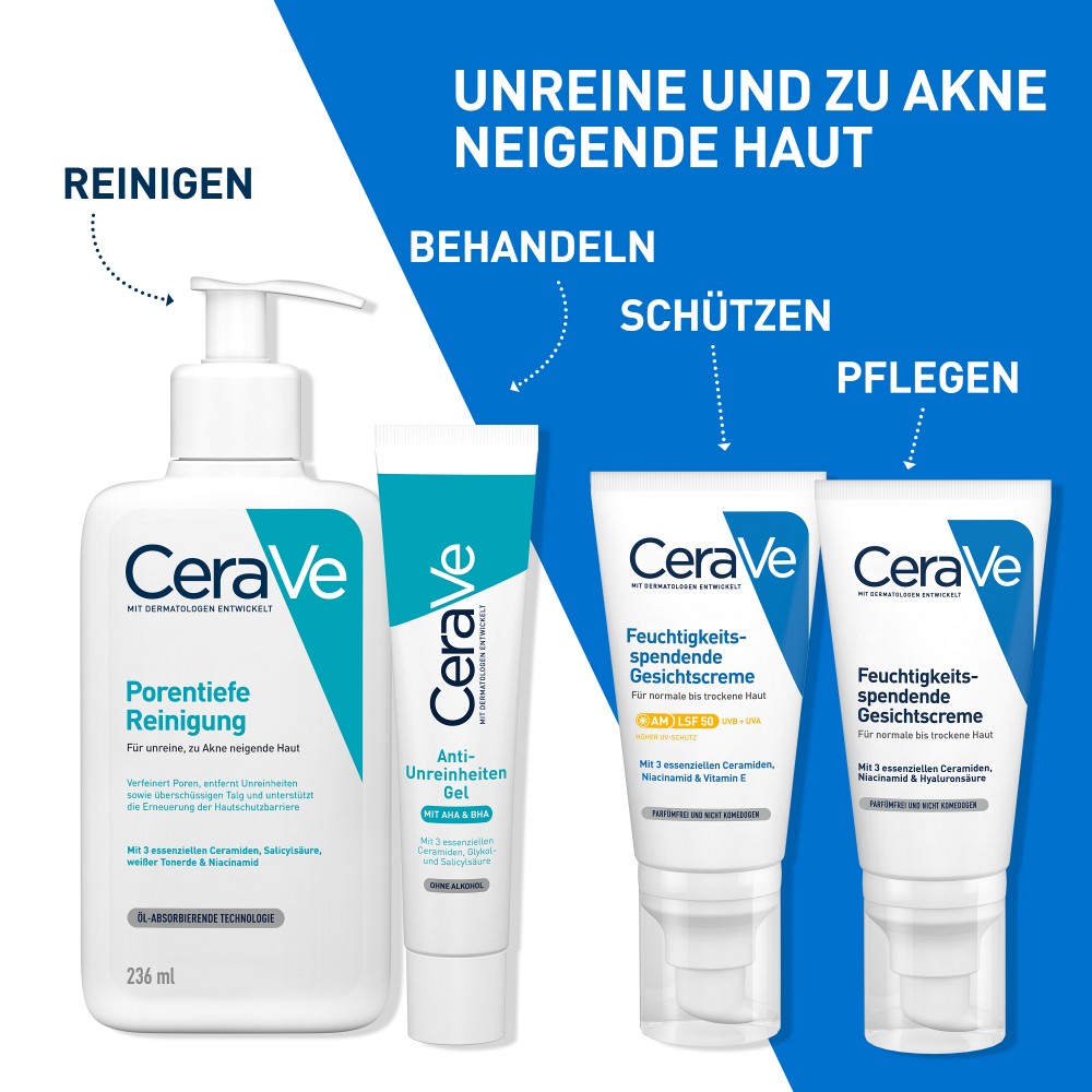 CeraVe Porentiefe Reinigung für empfindliche und zu Akne neigende Haut Die Porentiefe Reinigung von CeraVe befreit empfindliche Gesichtshaut sanft von überschüssigem Talg und wirkt Unreinheiten entgegen. Sie enthält Niacinamid und Salicylsäure, die abgestorbene Hautzellen entfernt und einer Verstopfung der Poren vorbeugt.Der Reinigungsschaum von CeraVe entfernt überschüssiges Öl durch den Reinigungsprozess und wurde speziell für fettige Haut entwickelt, die zu Unreinheiten und Akne neigt. Dabei entfernt die Reinigung überschüssigen Talg und trocknet die Haut nicht aus. Essenzielle Ceramide tragen zur Stärkung der Hautschutzbarriere bei.