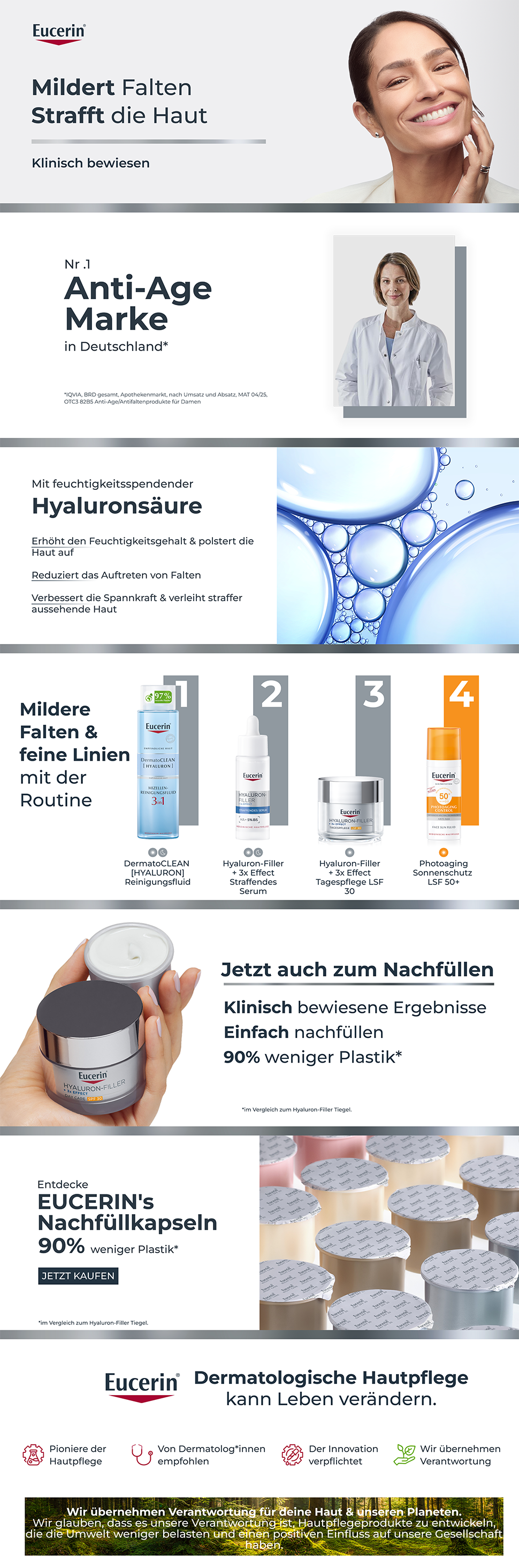Die Eucerin Hyaluron-Filler + 3x Effect Tagespflege LSF 15 für trockene Haut Nachfüllkapsel 50 ml spendet langanhaltende Feuchtigkeit, glättet Falten sichtbar und schützt mit LSF 15 zuverlässig vor UV-bedingter Hautalterung. Mit hochkonzentrierter Hyaluronsäure und Glycin-Saponin stimuliert die Anti Aging Creme die hauteigene Regeneration und verleiht ein glattes, jugendliches Hautbild.Die Tagescreme zieht schnell ein, ist nicht komedogen und somit die ideale Grundlage unter Make-up. Klinische und dermatologische Studien beweisen, dass die Hautpflege eine sehr gute Hautverträglichkeit und Wirksamkeit aufweist.