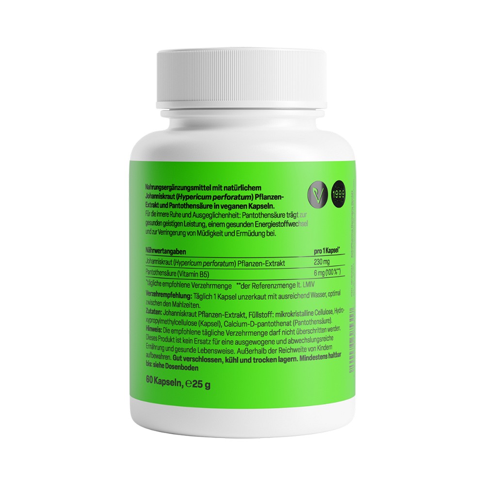 - Health support: St. John's wort (Hypericum perforatum) and pantothenic acid contribute to the maintenance of inner balance, normal mental performance, normal energy metabolism, and reduction of fatigue and tiredness