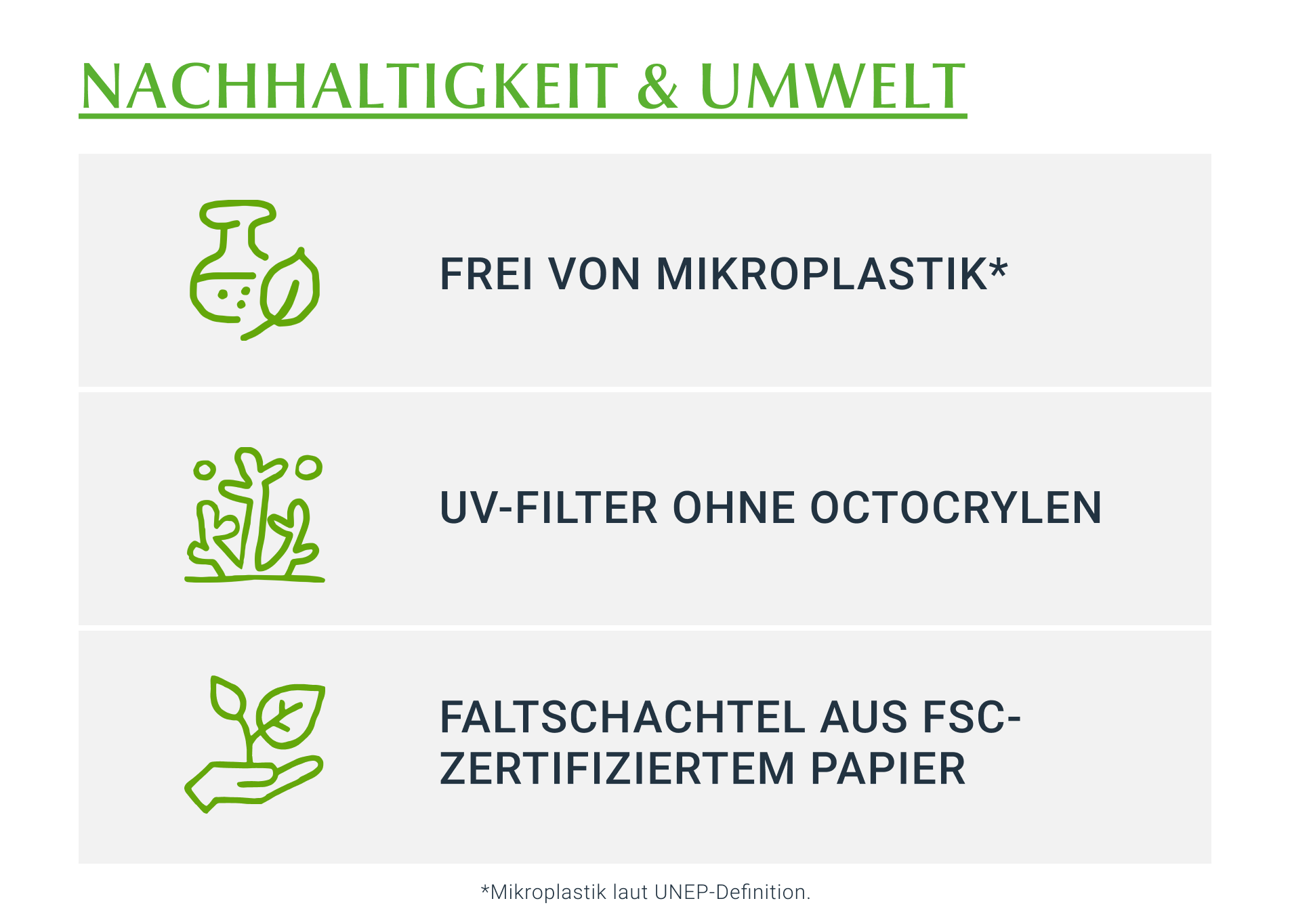 * Erfüllung der von Cosmetics Europe definierten hohen Standards für den UVA- und UVB-Schutz. Der UVA-Schutz liegt über der EU-Empfehlung.
