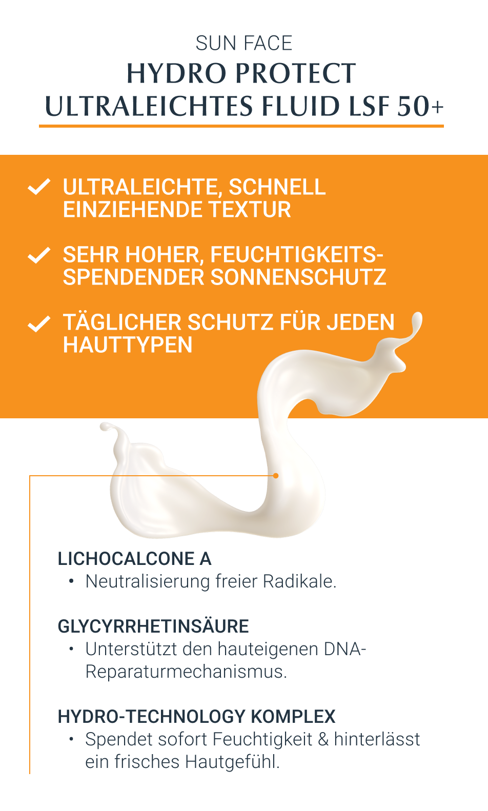 Das Eucerin Hydro Protect Ultraleichte Face Sun Fluid LSF 50+ ist eine Gesichtssonnencreme für die tägliche Anwendung bei allen Hauttypen.