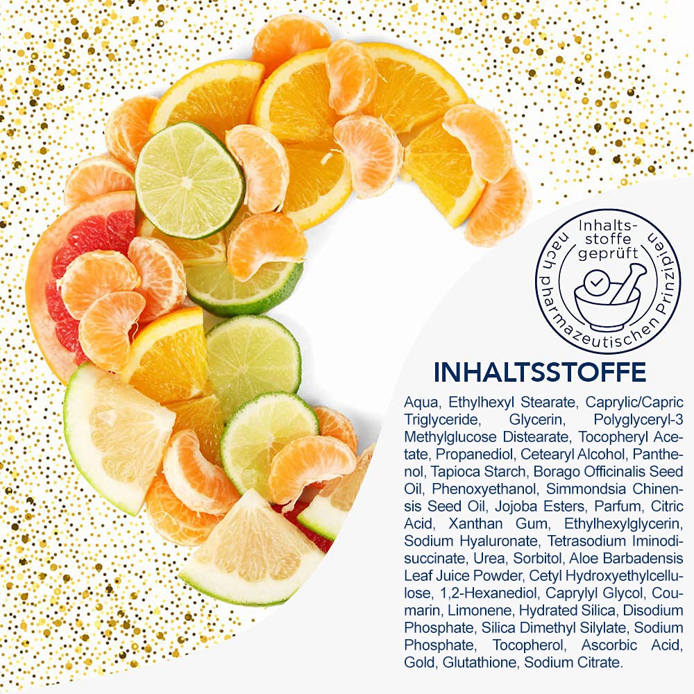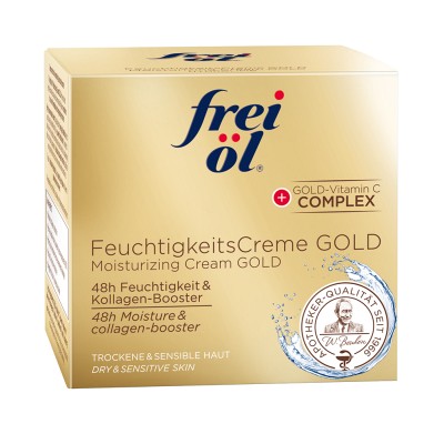 Die leichte frei öl® FeuchtigkeitsCreme GOLD mit weiterentwickeltem Hydro-Booster-Complex und pharmazeutischem Hyaluron versorgt die Haut sofort und langanhaltend mit Feuchtigkeit. Hochkonzentriertes Vitamin C stabilisiert durch feinste Goldpartikel wirkt besonders schnell und effizient.Als starkes Antioxidans schützt es die Haut vor freien Radikalen, regt den Zellschutz an und wirkt ausgleichend auf das Hautbild. Es stimuliert den Kollagenaufbau, stabilisiert und strafft die Hautstruktur und glättet Falten und Linien. Die Haut ist intensiv hydratisiert, gewinnt an Spannkraft und Glow und scheint praller und ebenmäßiger.
