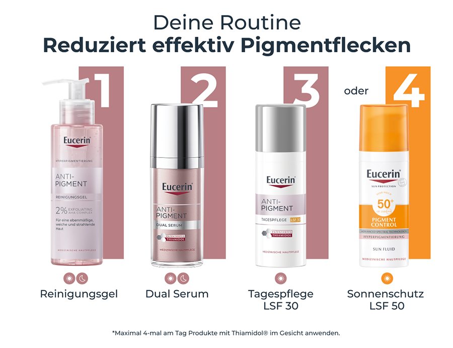 Für beste Ergebnisse das Eucerin Anti-Pigment Dual Serum als Teil der täglichen Feuchtigkeitspflege verwenden.