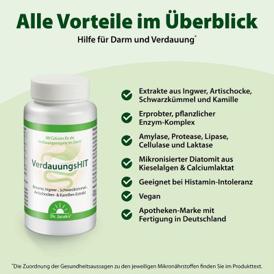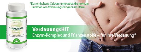 Die Verdauungsenzyme in unserem Organismus spalten aufgenommene Nahrung in ihre Einzelteile auf, damit die darin enthaltenen Nährstoffe vom Körper resorbiert werden können.VerdauungsHIT von Dr. Jacob’s enthält einen sinnvoll aufeinander abgestimmten Enzym-Komplex.