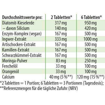 *Das in einer Tagesdosis VerdauungsHIT (à 6 Tabletten) enthaltene Calcium trägt zu einer normalen Funktion von Verdauungsenzymen im Darm bei.