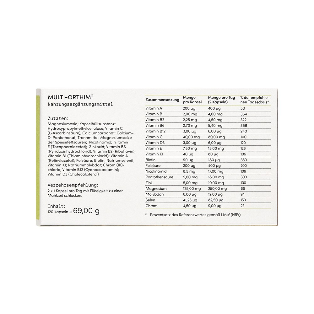MULTI-ORTHIM ist ein Nahrungsergänzungsmittel mit einer perfekten Kombination aus allen B-Vitaminen, Vitamin A, C, D3, E, und K1. Dazu kommen die Spurenelemente Zink, Magnesium, Molybdän, Selen, Chrom, Biotin und die Pantothensäure.