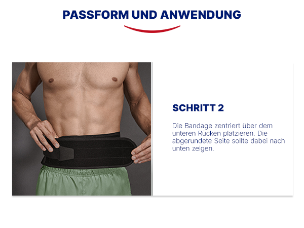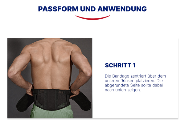 Schritt 1: Die Bandage zentriert über dem unteren Rücken platzieren. Die abgerundete Seite sollte dabei nach unten zeigen.Schritt 2: Die Hauptriemen um die Taille legen und bei leichtem Druck vorne mit dem Klettverschluss befestigen.