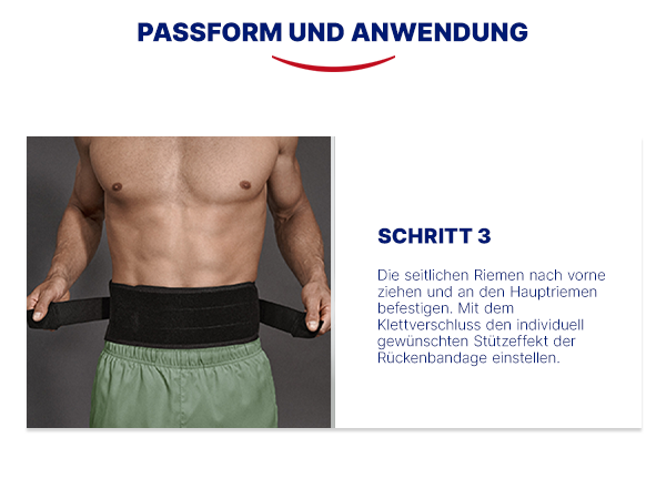 Schritt 3: Die seitlichen Riemen nach vorne ziehen und an den Hauptriemen befestigen. Mit dem Klettverschluss den individuell gewünschten Stützeffekt der Rückenbandage einstellen.