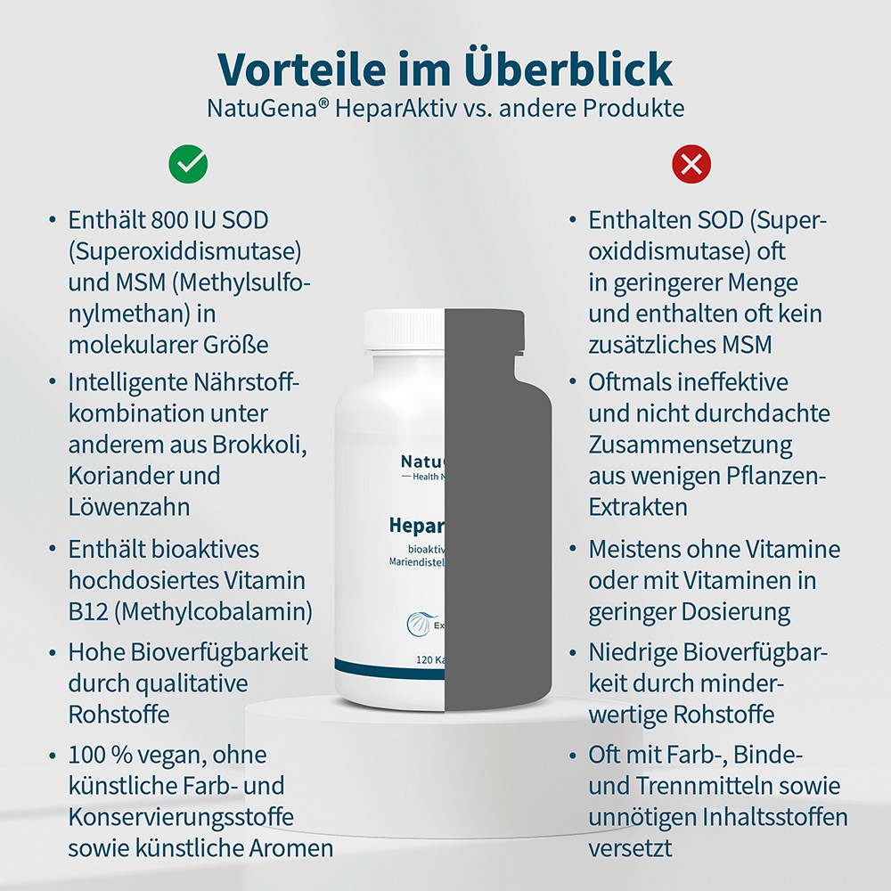 NatuGena HeparAktiv setzt auf eine ausgewählte Kombination aus Pflanzenextrakten, Bitterstoffen und bioaktiven Nährstoffen. Die Rezeptur vereint Pflanzenstoffe wie Löwenzahnwurzel, Mariendistel, Knoblauch und Brokkoli mit organischem Schwefel in Form von MSM (Methylsulfonylmethan).Ergänzt wird die Formel durch den hochwertigen Markenrohstoff Extramel, einen patentierten Superoxiddismutase-Extrakt (SOD) aus der Cantaloupe- Melone.
