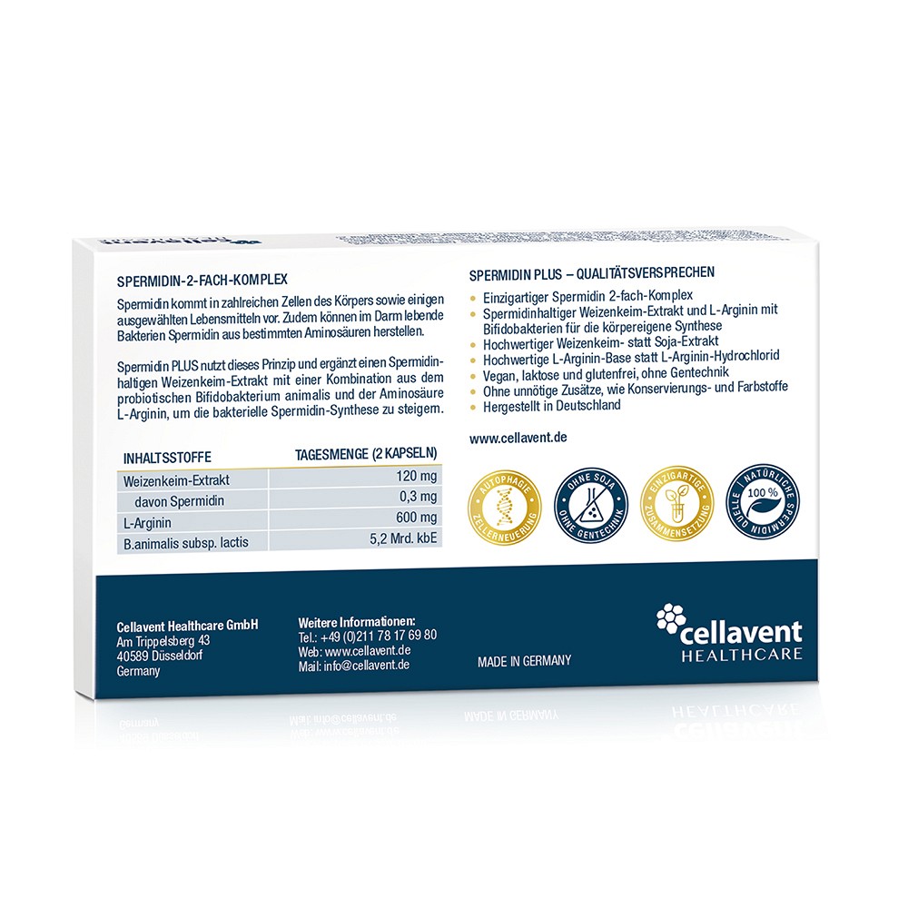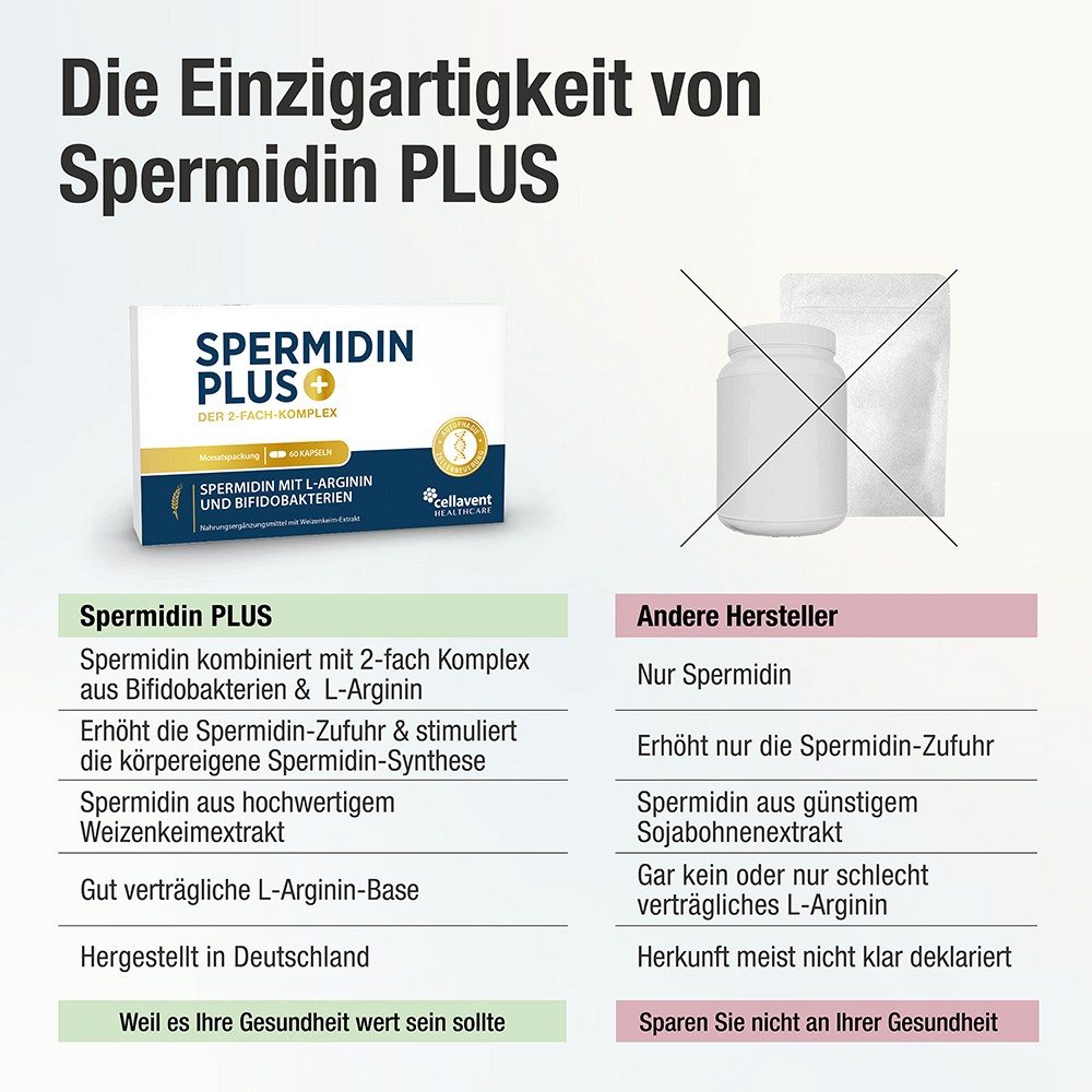 - Erhöht die Spermidin-Zufuhr und stimuliert die körpereigene Spermidin-Synthese