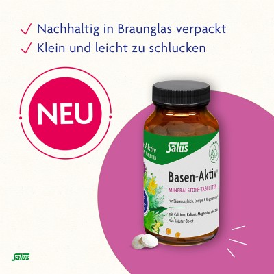 Die Basen-Aktiv® Mineralstoff-Kräuter-Tabletten können dabei gleich dreifach unterstützen: Das enthaltene Zink trägt zum aktiven Säureausgleicha) bei – Calcium, Magnesium und Kalium hingegen zur Energieb) und Regenerationc). Und ganz nebenbei passen die praktischen Tabletten in jede Tasche und eignen sich somit ideal für unterwegs.