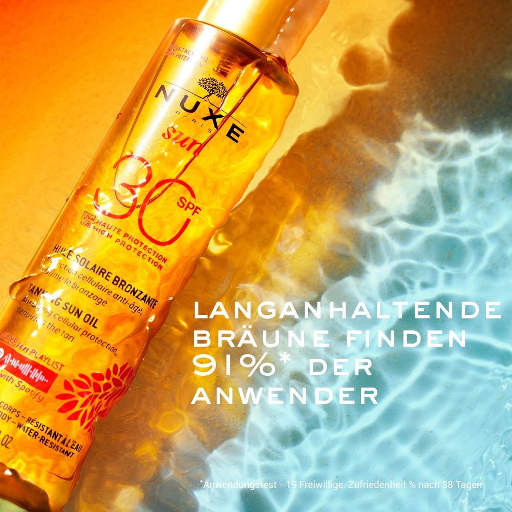 NUXE Sun – Bräunungs-Sonnenöl Gesicht und Körper LSF30: verstärkter Anti-Aging-Zellschutz (1). Dieses Bräunungs-Sonnenöl Gesicht und Körper LSF30 schützt Gesicht und Körper vor Sonnenstrahlen und optimiert die Bräune. Es basiert auf einem exklusiven (2), patentierten Filterkomplex und schützt vor UVA- und UVB-Strahlen, sodass die Haut dank des Zweifach-Schutzes vor UVA-Strahlen vor frühzeitiger Hautalterung geschützt wird(1).