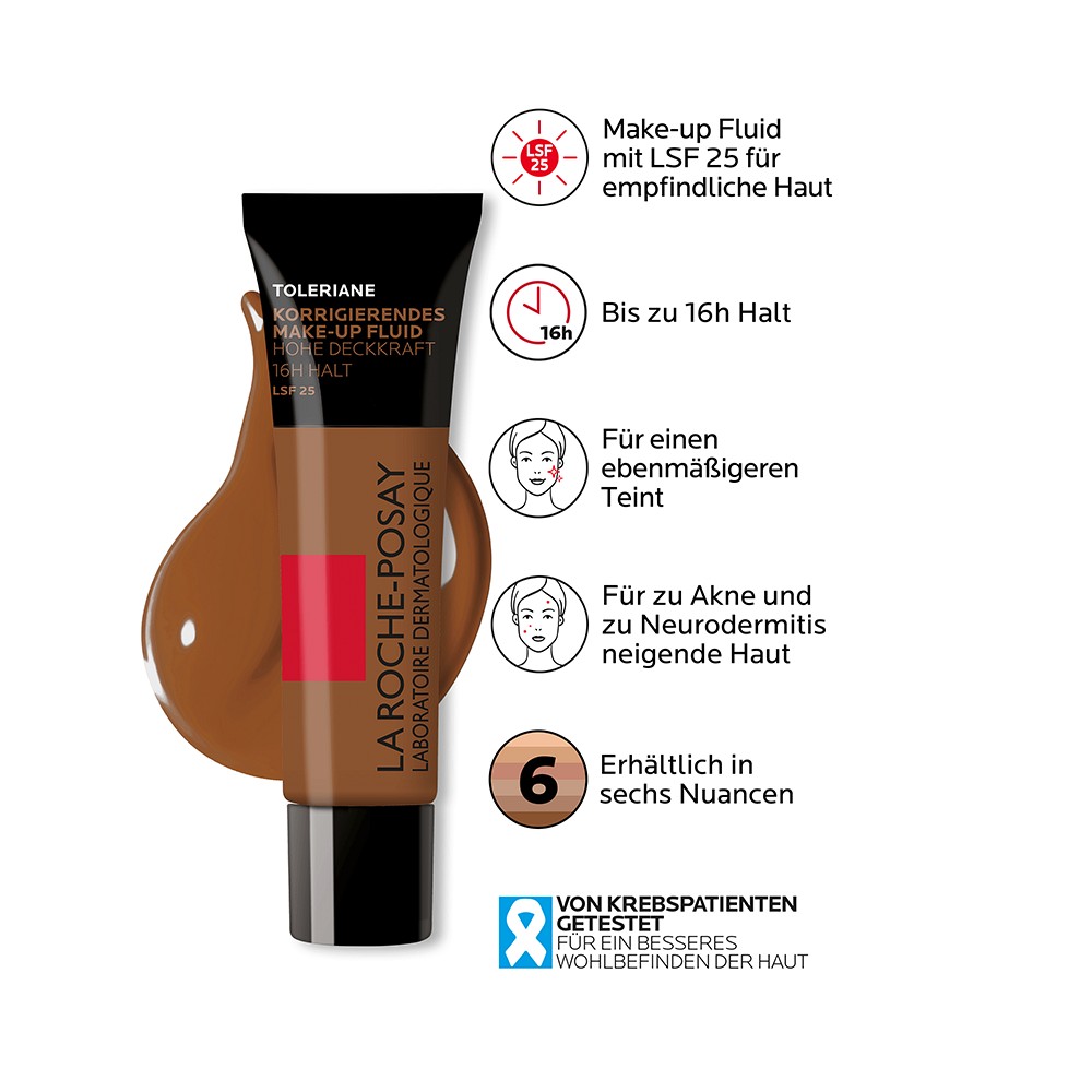 Das TOLERIANE Make-up Fluid von La Roche Posay ist ein korrigierendes Fluid, das Unebenheiten wie Pickel, Rötungen, Augenringe und Pickelmale bei unreiner Haut abdeckt. Die beruhigende Formel mit Neurosensine und Thermalwasser ist auch bei empfindlicher und zu Allergien oder Rosazea neigender Haut sowie während oder nach einer Krebstherapie geeignet.Dank LSF 25 schützt das getönte Fluid vor UV-Strahlen und beugt der Entstehung von Pigmentflecken vor. Die leichte, nicht fettende Textur mit feuchtigkeitsspendendem Glycerin besitzt eine ultrahohe Deckkraft, ohne maskenhaft auszusehen. Für einen ebenmäßigen Teint, der bis zu 16 Stunden hält. Erhältlich in sechs Nuancen.