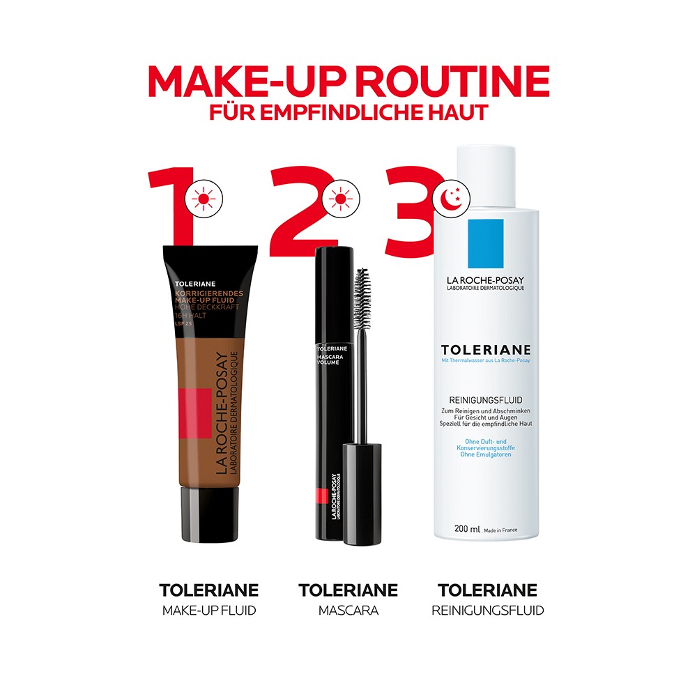 Als letzten Schritt der Pflegeroutine am Morgen eine kleine Menge des TOLERIANE Make-up Fluids mit den Fingerspitzen, einem Beauty-Schwämmchen oder einem Foundation-Pinsel von der Gesichtsmitte nach außen hin auftragen und die Übergänge sorgfältig verblenden.Stärkere Unebenheiten wie Augenringe oder Pigmentflecken können bei Bedarf mehrmals abgedeckt werden. Dabei ebenfalls darauf achten, dass keine auffälligen Übergänge entstehen.