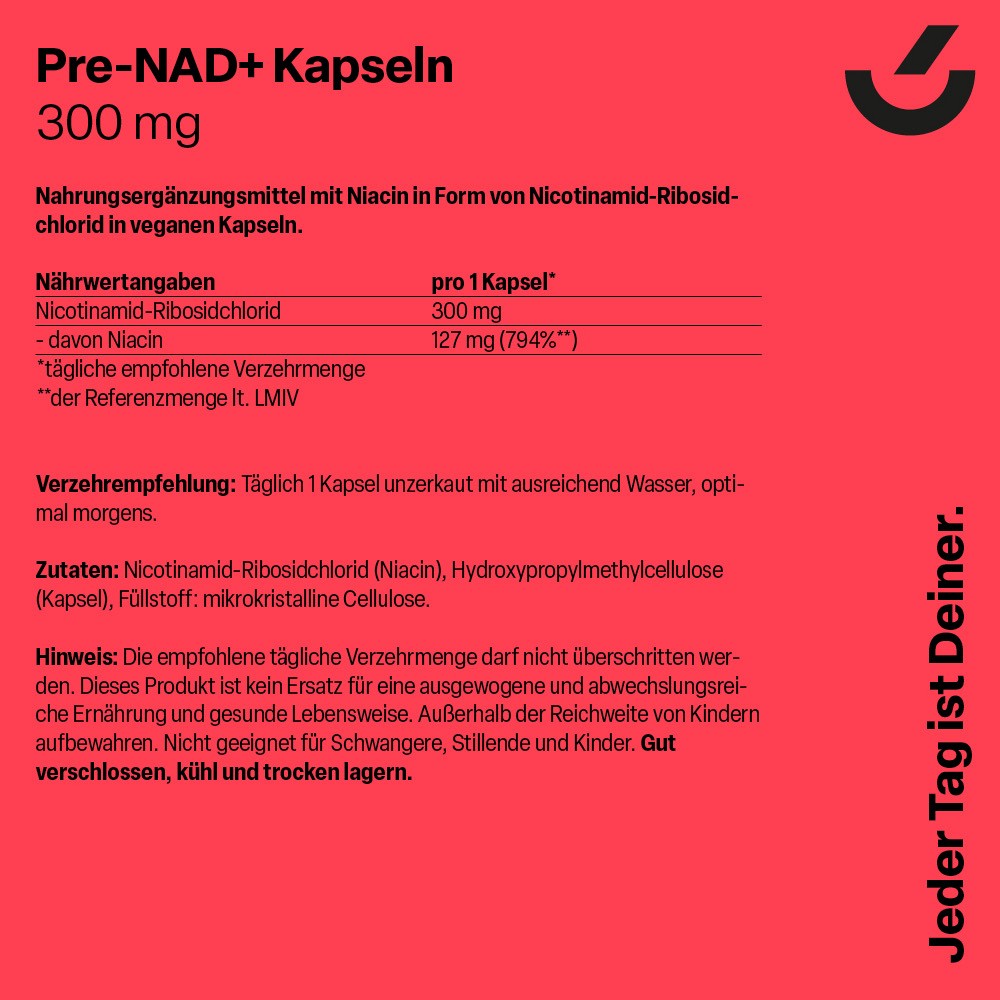 Pre-NAD⁺ enthält ausschließlich Nicotinamid-Ribosid (NR) – eine innovative, wissenschaftlich erforschte Form von Niacin und direkte Vorstufe von NAD⁺. *