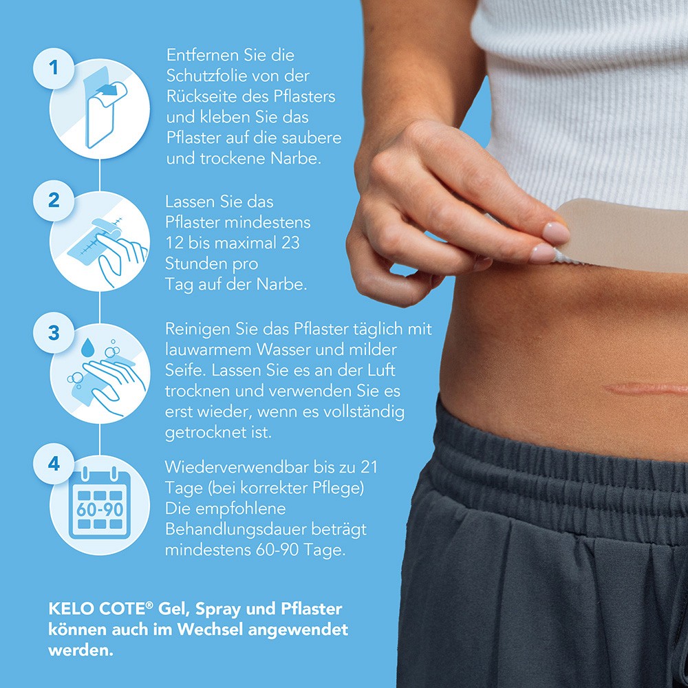 KELO-COTE Silikon-Narbenpflaster Kaiserschnitt können im Wechsel mit KELO-COTE Narbengel und Spray verwendet werden. Der Wechsel kann z.B. im Tag/Nacht Rhythmus erfolgen. Silikon-Narbenpflaster, Gele und Spray sollten aber nicht gleichzeitig (übereinander/mehrschichtig) verwendet werden.