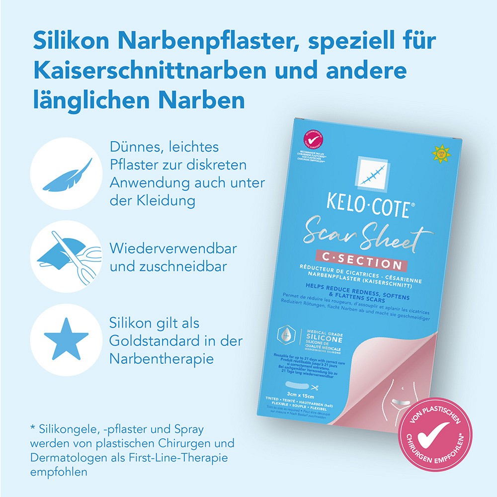 Durch KELO-COTE Silikon-Narbenpflaster Kaiserschnitt werden Narben nachweislich flacher, weicher und glatter. Mit Narben verbundene Beschwerden und der Juckreiz werden gelindert und die Hautverfärbung wird reduziert.