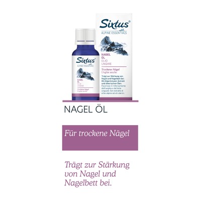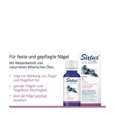 Trägt zur Stärkung von Nagel und Nagelbett bei. Mit Alpenkräuter-Extrakt und ätherischen Ölen. Sixtus Nagel-Öl ist ideal, um trockenen Nägeln wieder Geschmeidigkeit und neuen Glanz zu verleihen. Es spendet Nägeln und Nagelhaut Feuchtigkeit und lässt die Nägel wieder gepflegt aussehen. Wertvolles Weizenkeimöl beruhigt strapazierte Nagelhaut und wirkt dank seinem hohen Vitamin-E-Gehalt als Radikalfänger.