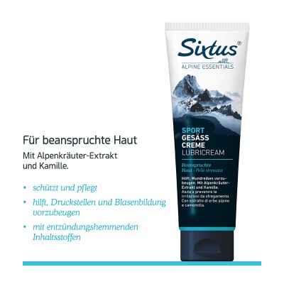 Hilft, Wundreiben vorzubeugen. Mit Alpenkräuter-Extrakt und Kamille. Für Rad-, Ruder- und Reitsport und viele andere Anwendungsmöglichkeiten mehr: Die Gesäss Creme ist eine der beliebtesten und bewährtesten Rezepturen im Sixtus-Portfolio! Sie schützt und pflegt sportlich beanspruchte Haut, macht sie elastischer und widerstandsfähiger. Zudem enthält sie entzündungshemmende Inhaltsstoffe. So hilft die Sixtus Sport Gesäss Ccreme, Wundreiben vorzubeugen und die Blasenbildung zu reduzieren.