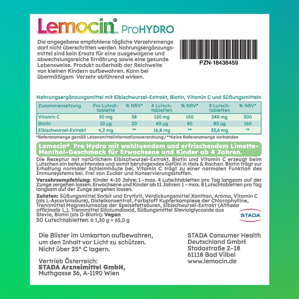 Das Lutschen von Lemocin ProHYDRO erzeugt eine wohltuende Befeuchtung und fördert so die Beruhigung von Hals und Rachen. Biotin trägt zur normalen Funktion der Schleimhäute bei. Eibischwurzel-Extrakt enthält Schleimstoffe, die sich wie ein Schutzfilm auf die Schleimhäute legen.Die Lutschtablette ist zuckerfrei und schmeckt nach frischer Limette mit kühlendem Menthol. Sie ist gut verträglich und daher bereits für Kinder ab 4 Jahren geeignet.