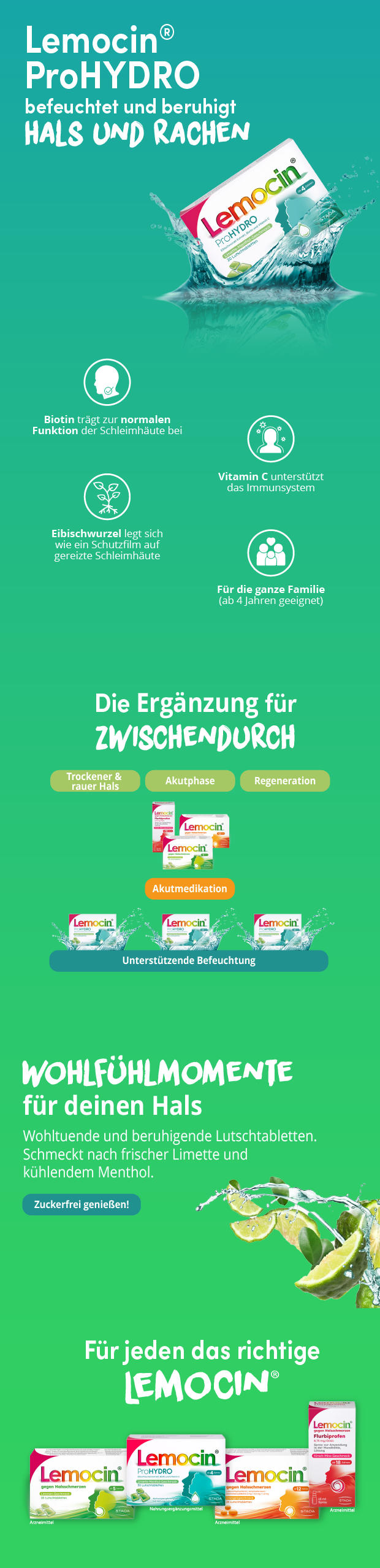 Halsschleimhäute werden im Alltag oft stark strapaziert: Lange und lautes Sprechen, Lufttrockenheit und wenig Flüssigkeitszufuhr fordern ihnen einiges ab. Hinzu kommen bei vielen Menschen bestimmte Medikamente oder Erkrankungen, welche die Schleimhäute im Hals- und Rachenraum reizen und austrocknen.Hier kann Lemocin ProHYDRO durch Befeuchtung und Beruhigung des Hals- und Rachenbereichs helfen.