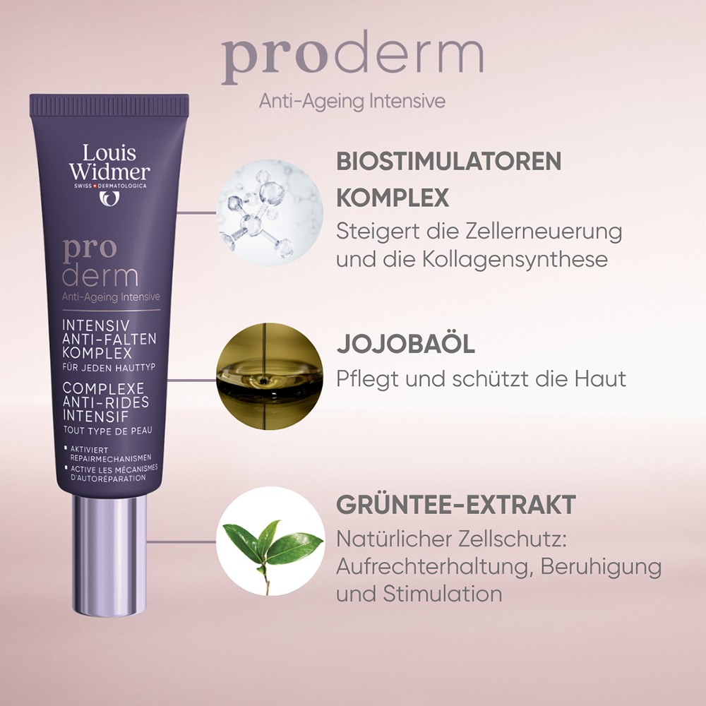 Proderm Intensiv Anti-Falten Komplex eignet sich für jedes Alter, besonders für die Hautpartien, die stark beansprucht sind. Auf die gut gereinigte Haut (Gesicht, Hals, Dekolleté) auftragen. Punktuell oder als Kur anwenden.Wirkstoffe: