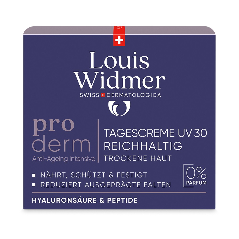 Die proderm Tagescreme UV 30 Reichhaltig wird als Tagepflege für trockene Haut verwendet – ideal für die reife Haut über 30. Nach der Reinigung auf Gesicht auftragen. Augenpartie aussparen.