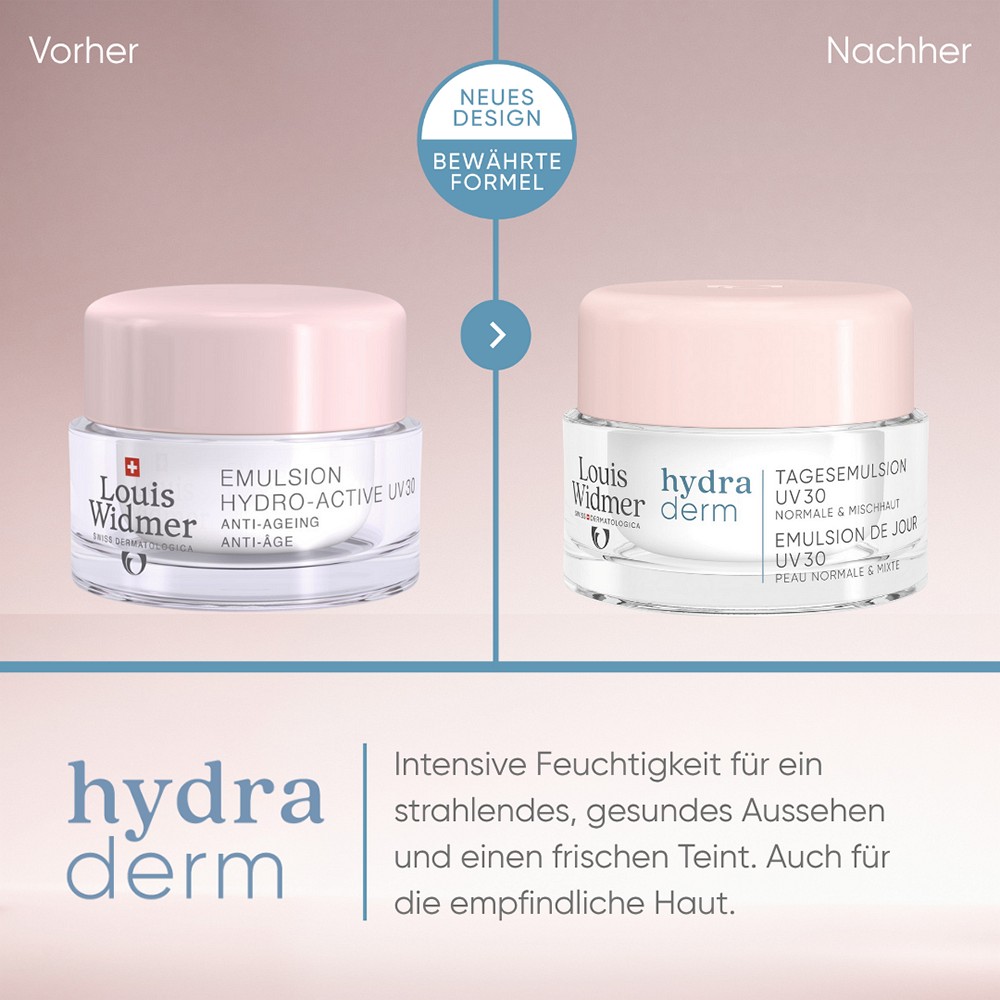 Die hydraderm Tagesemulsion UV 30 wird morgens nach gründlicher Reinigung der Haut aufgetragen. Augenpartie aussparen. Als wirksame Ergänzung der Tagespflege kann vorgängig das proderm Serum Extrait Liposomal als Basis-Tiefenkonzentrat angewendet werden.